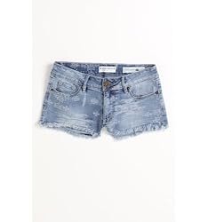 Jacquard denim shorts. Frayed hems. Bullhead button and zip fly front. Two front pockets, two back pockets. Low rise. 7" rise. 1" inseam. Measured from a size 3.